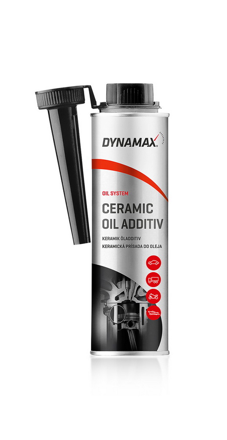 DYNAMAX Ceramic Oil Additive dopĺňa mazacie vlastnosti motorového oleja o najmodernejšie komponenty bez popola. Okrem toho, pomocou motorového oleja sa nano-keramické častice dostanú na tie miesta, kde môže vzniknúť trenie. Tieto nanočastice sa dostanú do povrchových nerovností (valcov, piestov, ložísk, piestnych krúžkov, ozubených kolies, atď.) a tam priľnú. Nanočastice okrem zníženia trenia vylepšia aj problémy tesnenia. Spolu s tým ide ruka v ruke aj zníženie spotreby oleja, ktorú každý spaľovací motor zo svojho princípu má.