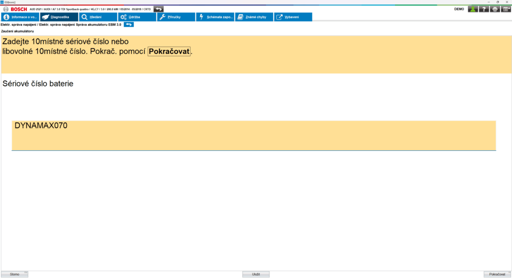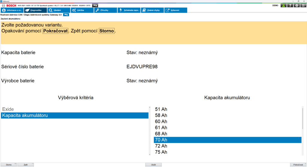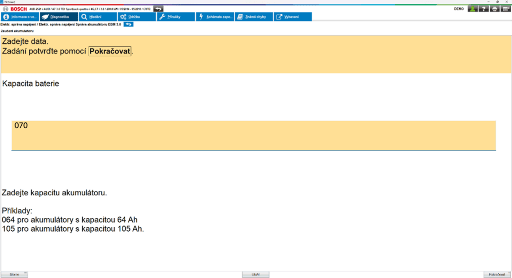 - Diagnostika vás vyzve na zadanie Ah kapacity batérie. Sem zadajte hodnotu ktorá je uvedená na etikete autobatérie.