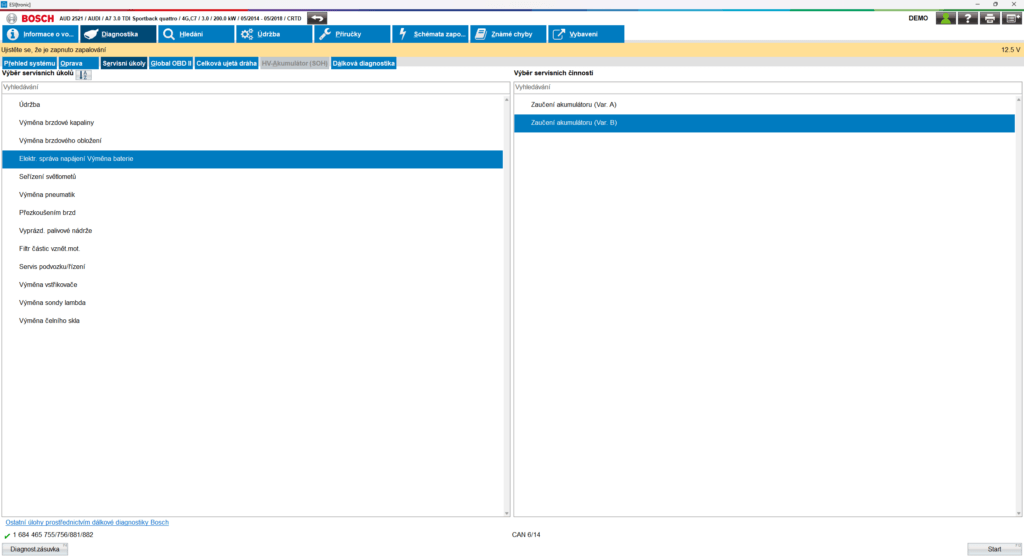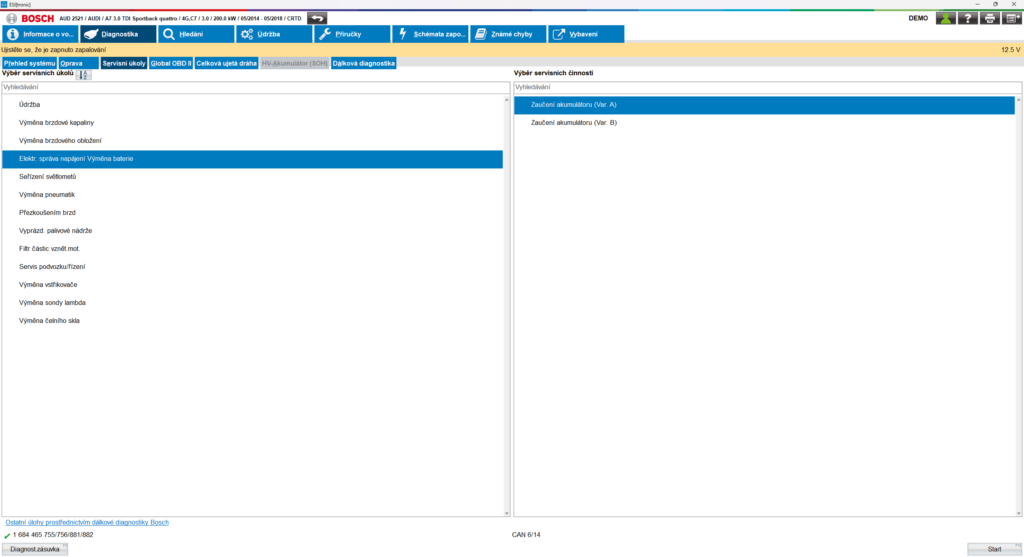 - Diagnostika => Servisné úlohy => Elektrická správa napájania/Výmena batérie => Zaučenie akumulátora (variant A)