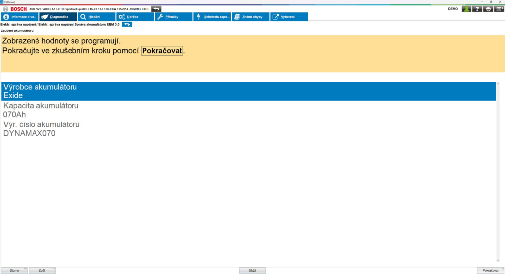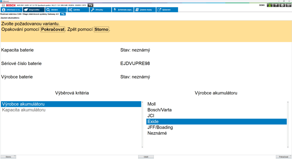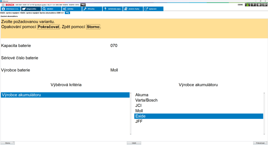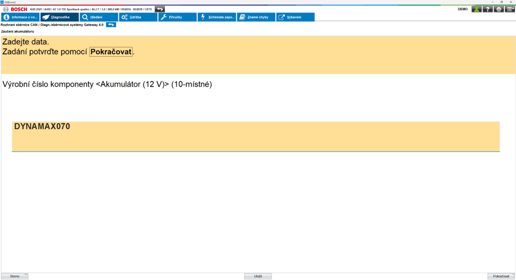 Konkrétny príklad diagnostického postupu pre nakódovanie batérie 70Ah pomocou BOSCH KTS560, Variant A na vozidle AUDI A7 2014-2018