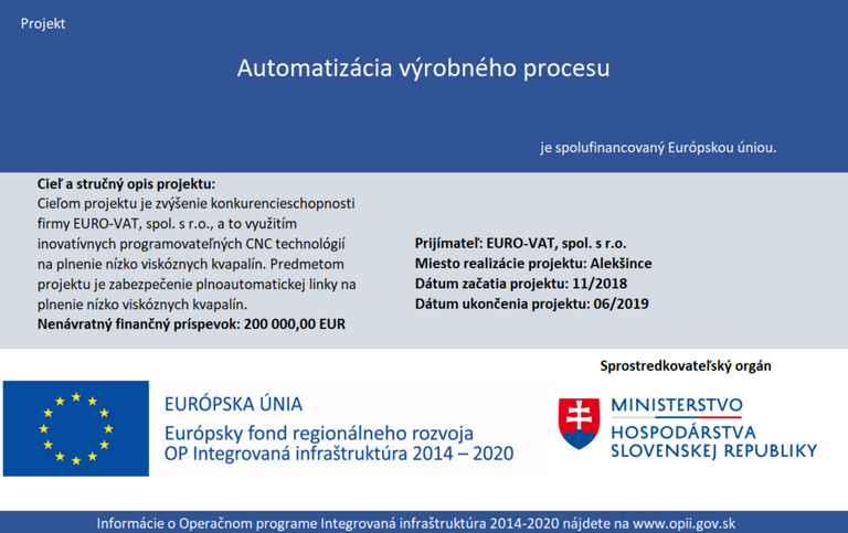 Projekt „Inovácia výrobného procesu EURO-VAT, spol. s r.o.“ je spolufinancovaný Európskou úniou. |