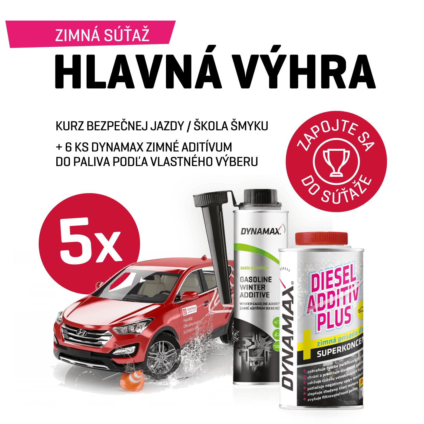 Hlavnou výhrou v súťaži je kupón pre celodenný Kurz bezpečnej jazdy – škola šmyku AUTO STANDARD na okruhu Slovakiaring pre rok 2023 vrátane certifikátu. Súčasťou hlavnej výhry je spolu a nerozlučne aj balík produktov DYNAMAX, ktorý pozostáva z aditív do pohonných hmôt DYNAMAX podľa určenia benzín/nafta v počte 6ks.