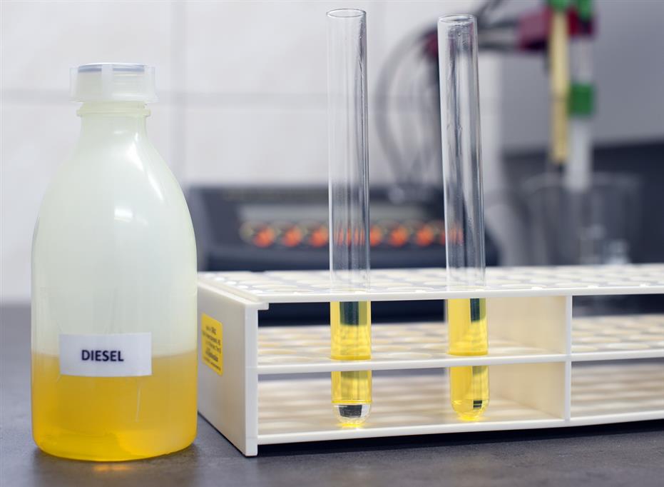 V skúmavke vľavo môžete vidieť príklad emulgovanej vody, ktorá klesne na dno a vytvorí v nafte samostatnú zložku.